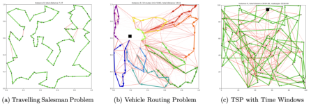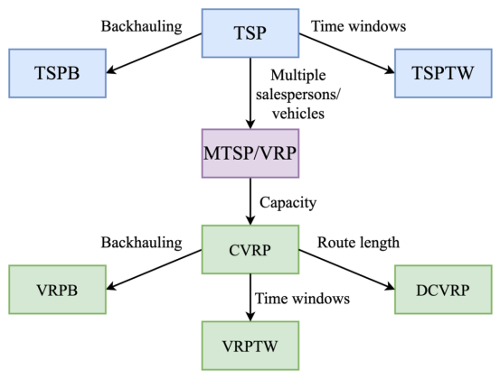 在现实世界和实际场景中,路由问题或车辆路由问题 (VRP) 可能会涉及超出普通的 TSP 的挑战性约束。例如,带有时间窗口的 TSP (TSPTW) 将「时间窗口」约束添加到 TSP 图中的节点。这意味着某些节点只能在固定的时间间隔内访问。另一种变体是,容量车辆路线问题 (CVRP) ,旨在为访问一组客户(即城市)的车队(即多个销售人员)找到最佳路线,每辆车都具有最大承载能力。