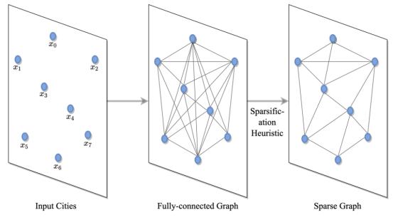TSP 是通过一个全连接图定义的,其中节点对应于城市,边表示它们之间的道路。该图可以通过启发式算法(例如 k-nn 最近邻算法)进行稀疏化。这使模型能够扩展到所有节点的成对计算都难以处理的大型实例中 [Khalil 等人,2017 年],或者通过减少搜索空间来更快地学习 [Joshi 等人,2019 年]。