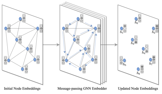 GNN 或 Transformer 编码器将 TSP 图中的每个节点和边,或者在两者中选择一个,作为输入来计算隐空间表示或嵌入特征。在每一层当中,节点从其邻居那里收集特征,再通过递归消息传递来表示局部图结构。堆叠 L 层后,网络就能从每个节点的 L 跳邻域中构建节点的特征。