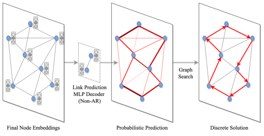一旦图的节点和边被编码为隐空间表示,我们必须将它们解码为离散的 TSP 解决方法。具体来说,可以通过两步过程完成:首先,将概率分配给每个节点或每条边来将节点或边添加到解集当中,无论是相互独立地(即非自回归解码)或是通过图遍历有条件地(即自回归解码)。接下来,通过经典的图搜索技术(例如由概率预测引导的贪心搜索或束搜索)将预测概率转换为离散决策(稍后我们将在讨论近期趋势和未来方向时,讨论更多关于图搜索的内容)。