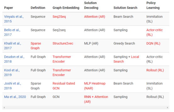 我们可以通过 5 阶段步骤来描述 TSP 深度学习中的杰出成果。回想一下,步骤包括:(1)问题定义→(2)图嵌入→(3)解码→(4)解搜索→(5)策略学习。下表从 Oriol Vinyals 及其合作者发表的指针网络论文开始介绍,红色突出表示该论文具有主要创新和贡献。