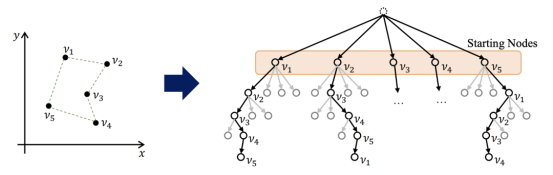 另一个有影响力的研究方向是一次性非自回归图卷积网络方法 [Joshi et al., 2019]。最近的几篇论文提出保留相同的门控 GCN 编码器(步骤 2),同时用更强大和灵活的图搜索算法替换束搜索组件(步骤 4),例如动态规划 [Kool et al., 2021] 或蒙特卡洛树搜索 (MCTS) [Fu et al., 2020]。