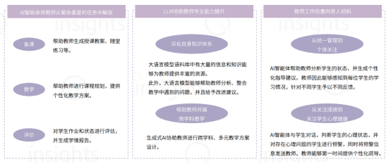 在工具使用上,AI降低了教师的学习成本,为其提供几乎零门槛的使用方式。在工作环节,AI帮助老师更高效地生成课件、提供教学设计思路等。
