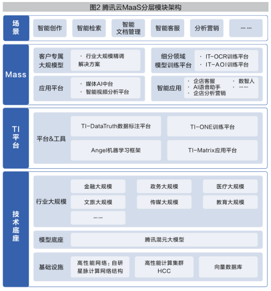 从数字组件生成性的角度看,这是一个技术分层架构与功能自然释放的过程。针对AI大模型的各类需求,腾讯集团结合多年的技术积累,推出了HCC高性能算力集群、腾讯云MaaS服务、向量数据库等产品,并发布了自主研发的通用大语言模型“腾讯混元大模型”,该模型支持主流开源模型在行业中的应用。产业的场景化需求驱动下,腾讯又呈现出全面绽放的态势。基于人工智能的技术潜能爆发,腾讯全面提升产业大模型的训练效率,在云上加速大模型技术的迭代升级和落地应用,已向二十多个行业输出五十余项大模型解决方案。依托云计算、人工智能等核心技术,腾讯集团推出四百多项数字化解决方案,帮助各个行业主体推动数字化转型,业务范围覆盖能源、零售、交通乃至政务等多个领域。