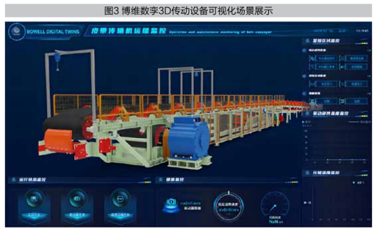 矿物行业拥有工业互联网最丰富和复杂的应用场景。博维数孪自主研发的数字孪生产品,率先将IoT、可视化、数据分析相关数字技术植入组件,并引入矿产行业丰富的应用场景中。作为矿物生产系统的关键设施,皮带传动设备关系到工作人员的生命安全,是矿业安全生产的重要环节。在生产过程中,这类设备会发生人工难以观测到的各种化学反应和物理变化。博维数孪通过数字孪生动态演示、工序流程可视化以及控制中心的多维分析,对传动设备的众多传感器数据进行立体化可视化呈现(见图3),将原先散落在众多业务系统中的数据进行了集成和互联互通。每一块煤的实时数据与相应信息流都将同步更新,确保工艺品质数据的即时在线监测。通过预测维护系统,还能够对工频异常、电气问题、机械组件磨损等多种潜在故障进行实时监控,从而为生产安全提供强有力的技术支撑,并促进矿物行业的高质量发展。