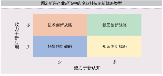 新兴产业起飞是科技创新快速发展的机遇,依靠科技创新,企业可以解决新兴产业技术应用中的实际问题,还可以为新兴产业发展依托的科技基础带来新认知。如图2所示,在新兴产业起飞阶段,企业可以从“致力于新认知”和“致力于新应用”两个战略维度出发,分别采用新质创新战略、技术创新战略、知识创新战略和场景创新战略来把握住科技创新快速发展的机遇。