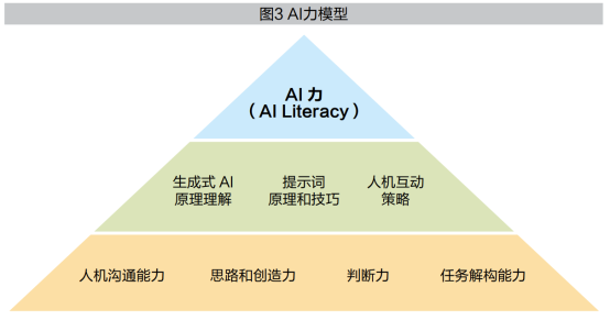 AI力是指在AI时代背景下,个体利用AI完成任务和解决问题必需的综合能力和知识体系。AI力构建在一系列核心技能和思维方式的基础上,涵盖了基本的技能及高级的理解和创造力(见图3)。