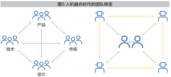 随着AI技术特别是AI 智能体的发展,我们预期会出现更多的超级AI工具,这些工具与超级个体相结合,将有可能彻底颠覆传统的组织模式。因此,未来企业的竞争优势有可能取决于员工的AI技能和效率。例如,一些只有寥寥几名员工就获得了高估值的初创公司,其员工不仅是全能通才,还具备强大的整合AI的能力。在这个超级个体与超级AI工具共融的新时代,产品开发团队可能将由一个庞大的跨职能团队转变为仅由两三个核心成员组成的小团队(见图5)。这些核心成员不仅具备广泛的技能,还能高效地将AI融入到各个工作流程中,实现极致的效率和创新。