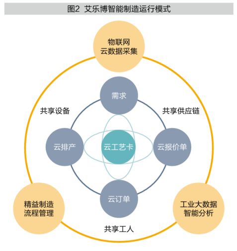 艾乐博抓住锅具生产环节的核心三要素“人机物”,确保数智化在思维、方法和工具三个层面同步推进。团队基于实践经验和对工业机器人生产全过程的深刻理解,将生产流程标准化、模块化、原子化。艾乐博的智能制造运行模式强调“物联网云数据采集、精益制造流程管理、工业大数据智能分析”的三位一体,基于其智能机加共享平台“易图灵”开展。该平台聚焦以数智化提升生产全流程的精细化与敏捷度,通过云计算技术建构“需求—云报价单—云订单—云工艺卡—云排产—智能交付”的闭环(见图2)。