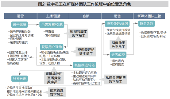 基于上述新媒体团队的岗位情况,从账号运维到最终的复盘诊断,总共涉及8个工作流程和6种岗位人员(见图2)。百聆科技公司在几个核心的工作流程中分别提供了7种数字员工角色,帮助各岗位人员承担部分工作任务,减轻他们的工作量,最终促进团队协作和提升组织绩效。