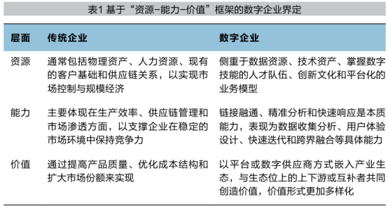 基于此,我们提出 “资源-能力-价值”框架,对数字企业进行界定(见表1)。