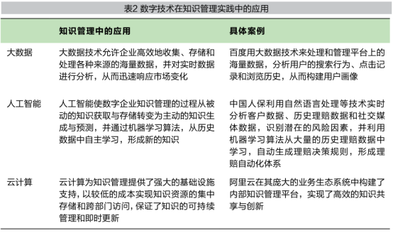 数字技术具有可供性,引入数字技术能够为知识管理带来新的工具,提高数字企业的知识管理能力。现有的知识管理实践表明,大数据技术的引入使得数字企业能够借助数据挖掘、自然语言处理等技术处理海量数据,通过实时分析和预测性建模支持决策过程;人工智能技术能够不断学习历史数据,不断优化知识提取和管理流程,实现知识管理的自动化和智能化,提高了知识管理的效率;云计算的引入提供了海量的存储空间,将大量的知识和数据存储在云端,使得知识的存储和访问更加灵活和便捷,支持了知识管理系统的扩展和升级(见表2)。此外,区块链和量子计算等的进一步发展,将支持基于隐私保护和权责清晰的数据资产应用,从而激励更多可能更高维度的知识创新。总而言之,数字技术的深度应用,将提升数字企业知识管理快速与精准响应等能力,将助力知识管理中的数据收集、分析与治理等工作。