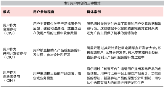 在知识管理层面,用户作为信息源参与提供了来自实际使用场景的直接反馈和数据,能够帮助企业更好地理解产品在现实世界中的表现和用户的真实需求,有助于企业形成市场环节、用户需求等形式的知识。用户作为共同开发者参与除了能有效获取用户需求,还能够引入用户的创意和经验,获取更多样与更高质量的知识。用户作为创新者参与将用户从被动的信息提供者转变为主动的创新贡献者,带来全新的业务模型、产品和服务创意。