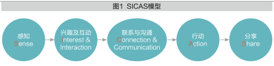 SICAS模型是DCCI互联网数据中心在2011年所提出的移动互联时代下的消费者行为模型,如图1所示,其由“感知(Sense)”“兴趣及互动(Interest & Interaction)”“联系与沟通(Connection & Communication)”“行动(Action)”“分享(Share)”五个部分组成,涵盖消费者从接触产品到使用再到反馈的全流程。它与以往研究的最大不同在于,强调了消费者和公司等相关方之间所开展的互动行为,对网络和数字时代下的消费行为做出了更为系统全面的阐释。