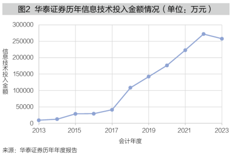 作为头部券商,华泰证券经营管理层对数字化技术认知具有前瞻性和敏锐性,不仅在外部数字化信息挖掘和评估方面具备优势,还能够承担数字化技术投入可能产生的风险。这使得同样在面临外部数字技术革命冲击时,华泰证券能够比同行业企业更快抓住机遇并予以响应。