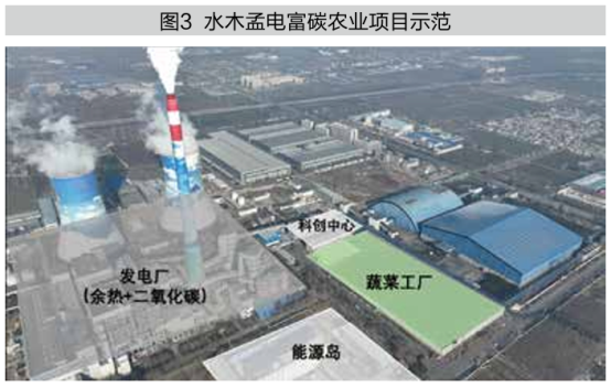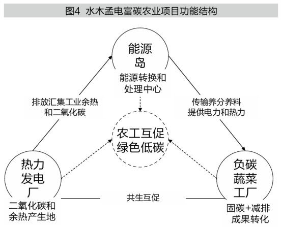 2021年,水木九天在河南新乡启动水木孟电富碳农业项目,成为亚洲首个发电厂内的农业项目(见图3)。“富碳农业”是一种新兴的农业模式,其核心是将工业生产中排放的二氧化碳收集后,作为“气肥”用于农业生产,通过优化光、气、温、水、肥、种等条件组合,创造高效的光合作用环境,从而实现农作物的增产、提质和生态环保。该项目利用发电厂的余热和二氧化碳进行农业生产(见图4),以此应对气候变化、减少能源消耗,并提升农业效益。这一农业生产模式荣获联合国工发组织颁发的零碳城市创新典范奖,并被推广至水泥厂、垃圾焚烧发电厂、钢铁厂、造纸厂和污水厂等多种工业场景,实现农业与工业的融合互促。2023年7月,河南省委书记走访调研该蔬菜工厂,特别考察了其在极端高温条件下的运转能力。在46℃的室外温度和65℃的地面温度中,该工厂仍能保持连续生产,成功解决了高温条件下农业生产的国际难题。同年12月,美国驻华大使馆一等秘书专程访问该工厂。水木九天在中国以煤炭为主要能源的背景下创新开发的固碳策略,为全球农业低碳发展提供了中国方案。